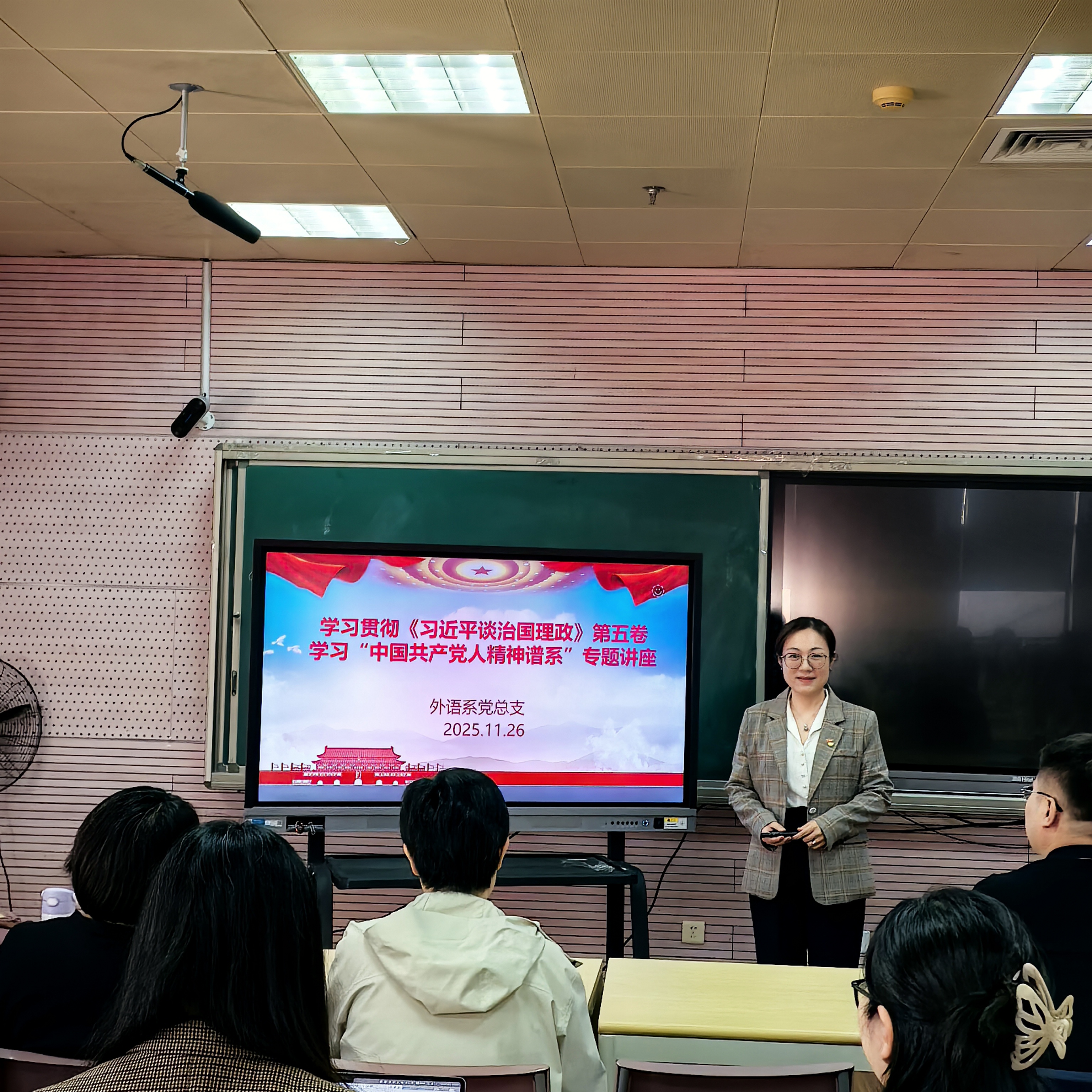 11月26日下午,外语系党总支在景祺楼6楼智慧教室举办学习《习近平谈治国理政》第五卷和“中国共产党人精神谱系“专题讲座,讲座以“坚定制度自信 传承精神谱系 迈向伟大复兴“为主题,特邀马克思主义学院副教授林颖担任主讲,全系师生党员参与学习。