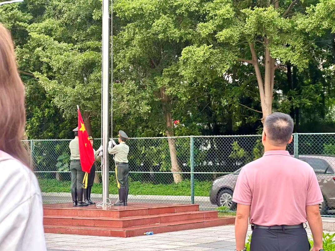 迎着旭日的晨曦,伴随雄壮的国歌,全体师生庄严肃立,面向国旗行注目礼。升旗仪式结束后,徐泉辉做了主题为“礼行校园,安全谨记”的国旗下讲话。徐泉辉在讲话中特别强调了新老生学期目标的差别,指出新生要积极规划蓝图,明晰发展路径,为未来的大学生活奠定坚实基础,而老生要有切实可行的职业规划,珍惜时光,把握机会,迎接属于自己的就业挑战。同时,他号召全体同学遵守校园文明礼仪规范,注重穿衣打扮,保持仪容端正,时刻展现外语学子的精神风貌,共同营造文明和谐的校园氛围。最后,徐泉辉还围绕消防用电、网络言行、反诈防骗、身心健康、校园防蚊等方面开展安全教育,特别强调要注意宿舍用电安全,禁止在阳台堆积书籍、纸箱、杂物等易燃物品,也禁止在教学楼、宿舍楼、实验楼、活动中心等室内场所吸烟,引导同学们将安全意识入脑入心,有效提升了大家的自我防范能力。