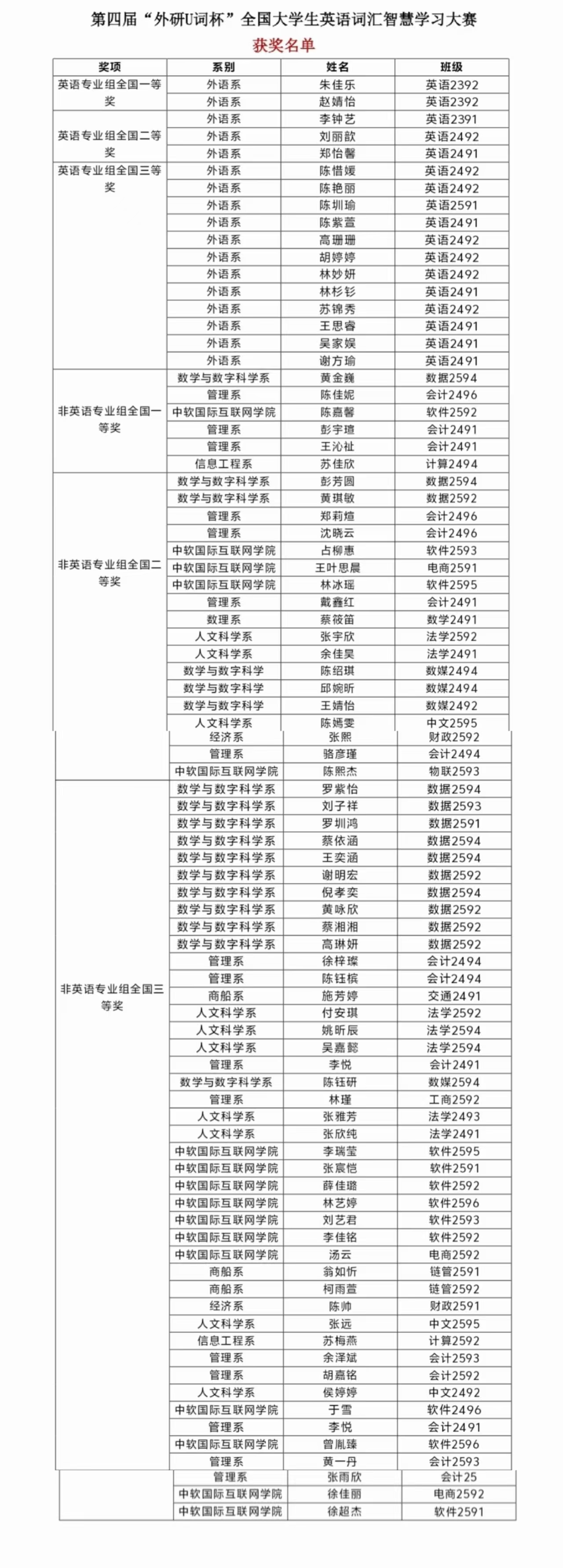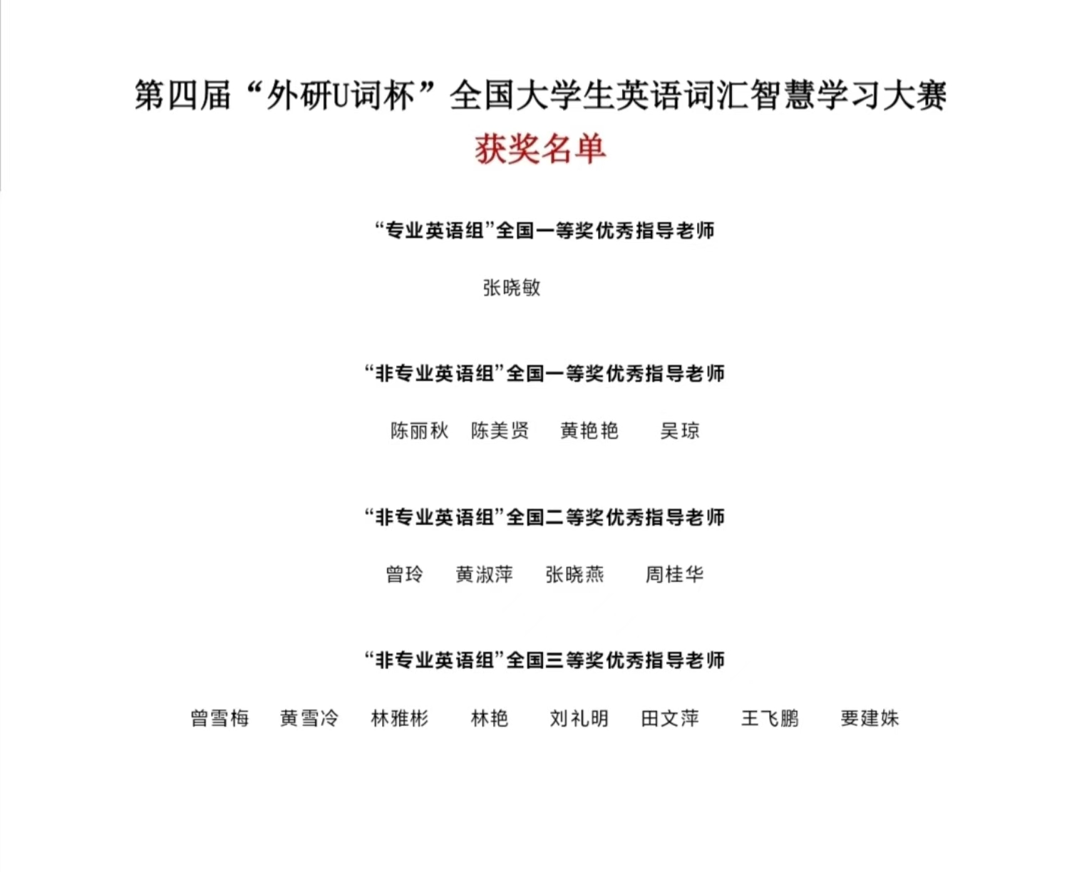 近日,我院多名学子在第四届“外研U词杯”全国大学生英语词汇智慧学习大赛中荣获佳绩。其中,2位同学荣获“英语专业组”全国一等奖、3位同学荣获“英语专业组”全国二等奖、12位同学荣获“英语专业组”全国三等奖;6位同学荣获“非英语专业组”全国一等奖、18位同学荣获“非英语专业组”全国二等奖、43位同学荣获“非英语专业组”全国三等奖;外语系张晓敏、陈丽秋和陈美贤等17位老师荣获优秀指导教师奖。