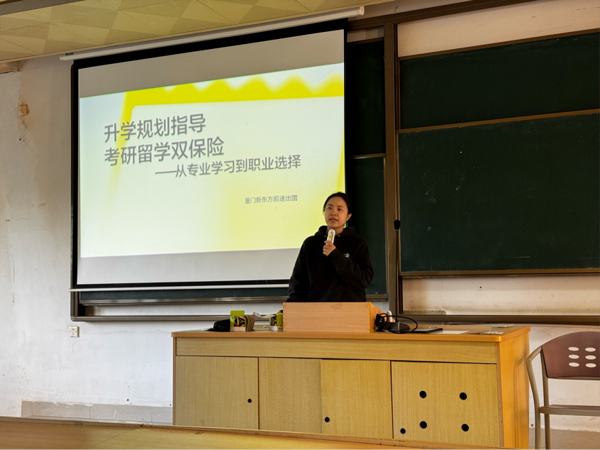 为进一步帮助同学们明晰学业发展方向,科学规划升学路径,2025年11月21日,外语系在教学楼9-205开展了“成长双驱,才启未来”2024级考研留学双规划专题讲座。讲座特邀厦门新东方前途出国欧亚事业部咨询经理韩帅担任主讲,全体2024级英语专业学生参加。